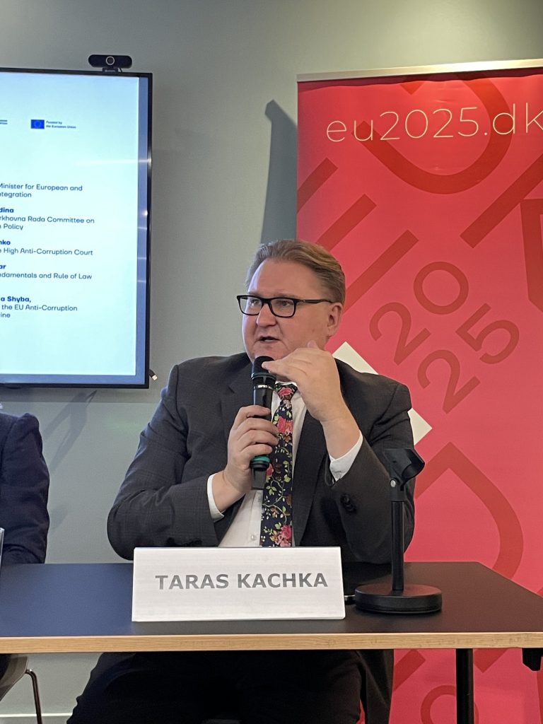 In the panels were Taras Kachka, Deputy Prime Minister for European and Transatlantic Integration of Ukraine; Anastasiia Radina, Chair of the Verkhovna Rada Committee on Anti-Corruption Policy; Yaroslav Zhelezniak, Member of the Parliament of Ukraine; Vira Mykhailenko, President of the High Anti-Corruption Court; Polina Lysenko, Deputy Director of the National Anti-Corruption Bureau of Ukraine; Andrii Borovyk, Executive Director of Transparency International Ukraine; Wolfgang Nozar, Head of Fundamentals and Rule of Law Unit, DG ENEST; and Allan Pagh Kristensen, Head of the EU Anti-Corruption Initiative (EUACI).