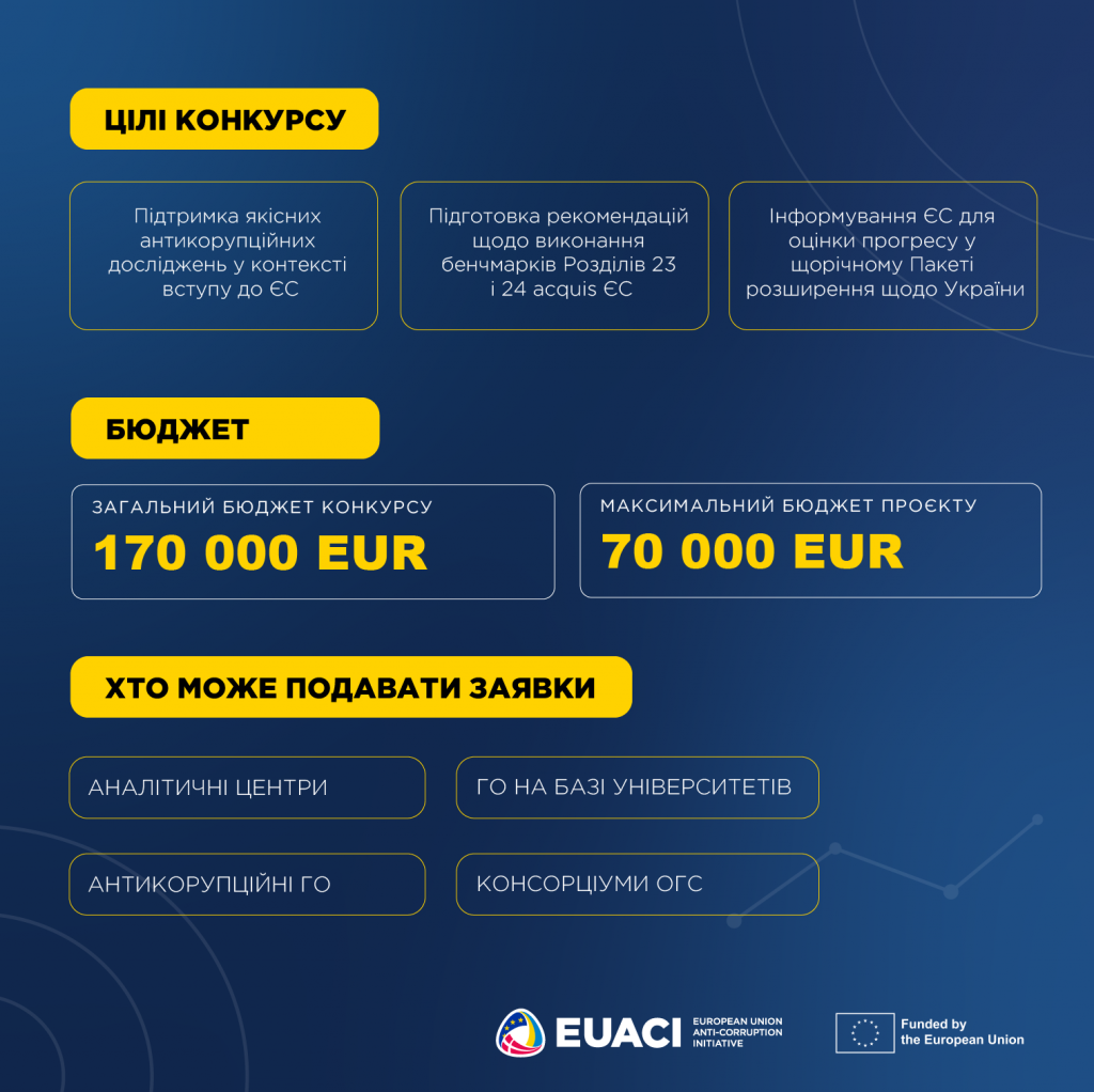 Антикорупційна ініціатива ЄС (EUACI) надасть фінансування для проєктів, які досліджують антикорупційні реформи в контексті вступу України до ЄС.