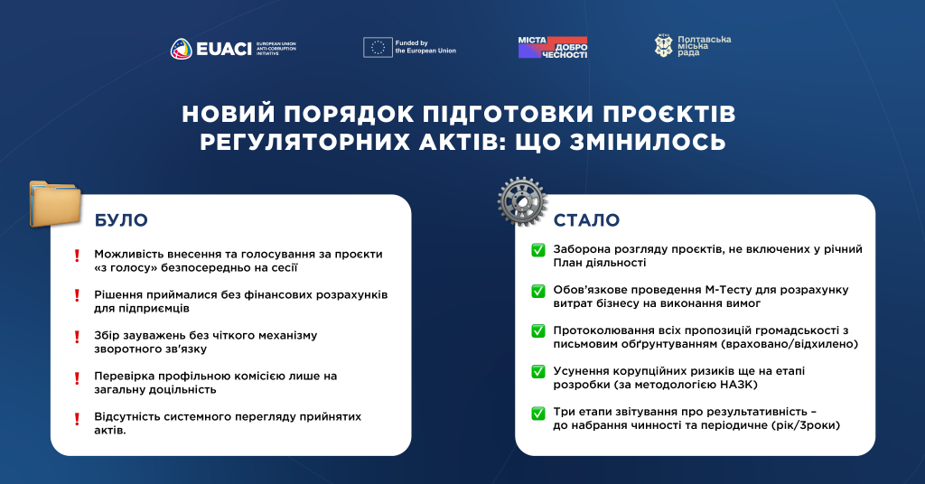Від якості та прозорості ухвалення міських рішень залежить економічний розвиток громади та її інвестиційна привабливість. Полтавська міська рада затвердила новий Порядок підготовки проєктів регуляторних актів – документів, що встановлюють єдині правила у сфері бізнесу, тарифів та благоустрою.