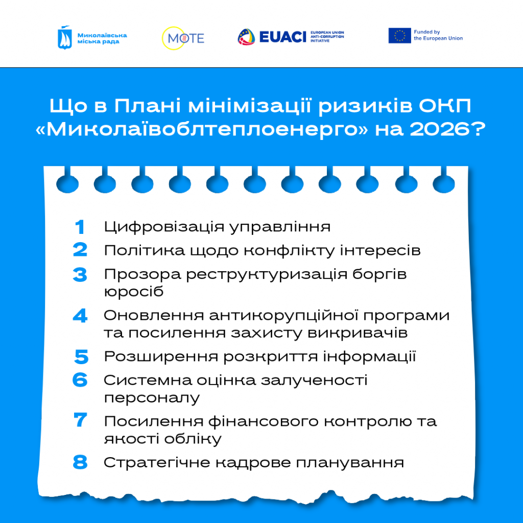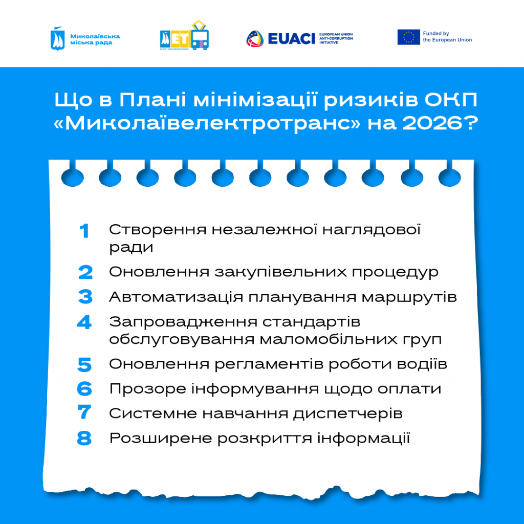 Співпраця з Миколаєвом у напрямку трансформації комунального сектору продовжується. Після проведення комплексної Оцінки доброчесності двох стратегічних підприємств міста, переходимо до етапу впровадження змін.